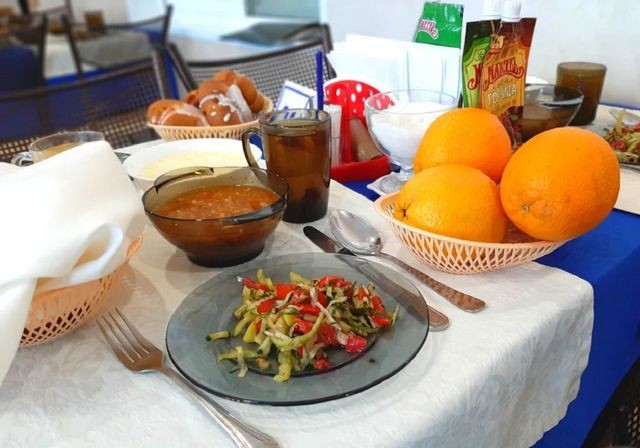 В зависимости от выбранной категории номера питание осуществляется по трём типам: шведский стол, заказное меню или ресторан. Меню составлено с учётом калорийности и сбалансированности продуктов. Повара готовят полезные салаты из овощей и зелени, сытные вторые блюда из птицы, мяса и рыбы, наваристые супы, выпечку и десерты. Для постояльцев ежедневно подают натуральный кофе и свежие фрукты.